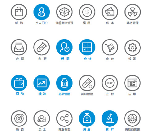 KTHRP具备完整的人财物管理体系,除了基础的个人门户、人事、薪酬、会计、应付、应收、费用、耗材、物资、药品、固定资产等功能模块,还有提升管理水平的管理模块,比如绩效、预算、项目经费、合同、SRM、BI等,可以根据用户管理的需求选择安装使用。