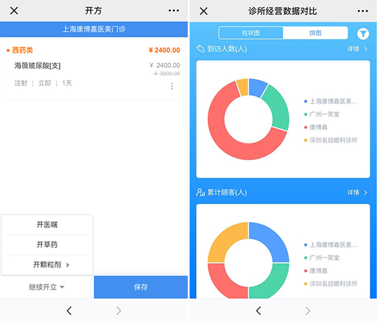 无论发展方向如何,中医馆都需要医疗信息化为之赋能。康博嘉云诊所“中医版”有浓厚的中医学科和业务特性,更有强大的互联网营销属性。患者、医生、管理者可以通过微信端进行就诊、看诊及经营。患者可以在线预约、挂号、缴费、消费、查询病历等。医生可线上开医嘱、草药、颗粒剂,可以代煎草药,复诊患者不用反复跑医馆,所需的药品直接送到家。管理者可以随时随地用手机查看关心的经营数据,发现问题,解决问题,优化经营。