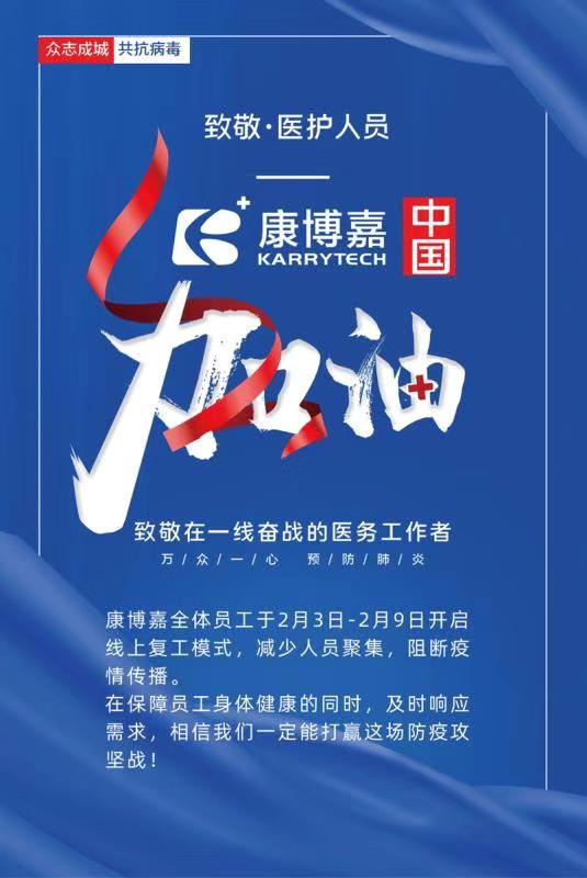 疫情当前,众志成城,全民抗疫,线上复工。面对疫情,康博嘉根据全国员工实际情况分别制定了有针对性的应对措施,公司时刻提醒每一位员工注意防护。康博嘉心系奋战在一线的医务工作者,及时响应国家号召,为防疫控疫贡献自己的绵薄之力。