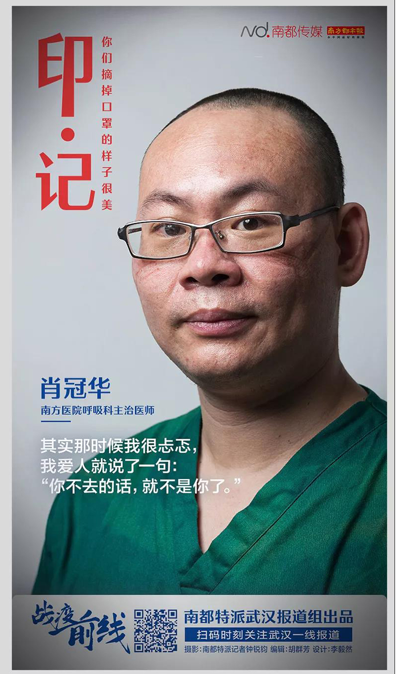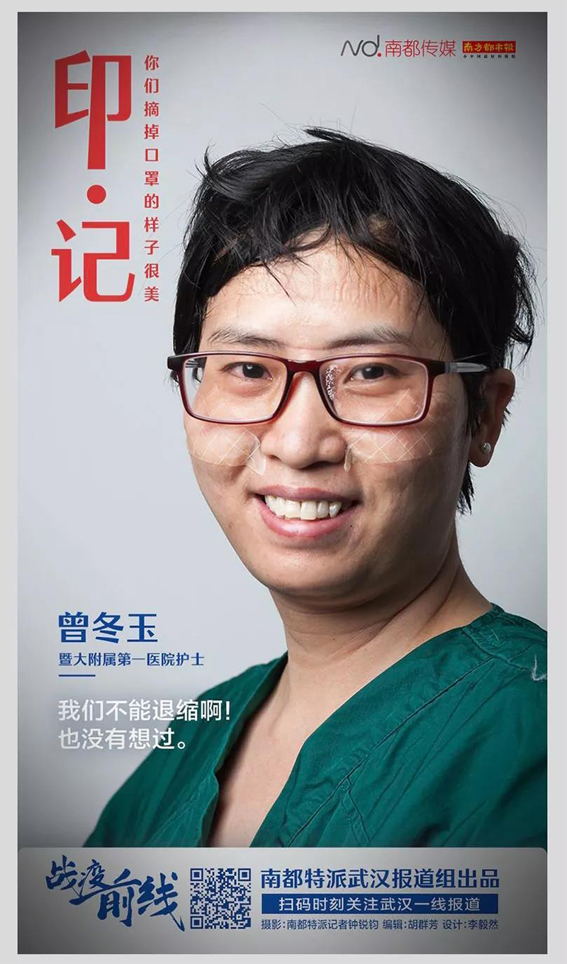 【印·记 你们摘掉口罩的样子很美】一组由南方都市报南都特派武汉报道组出品的《印·记》系列海报火爆全网,一张张海报真实记录了广东省援助湖北医疗队一线医务人员摘掉口罩后的样子。虽然每个人脸上伤痕累累,但在我们眼里这是“天使的吻痕”,他们是很美的。这种美,是勇气,更是责任。