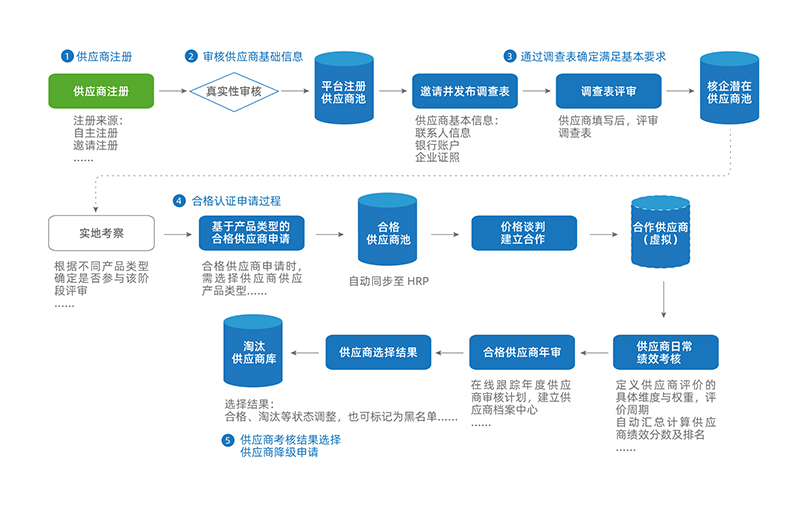供应商准入及资质管理:包括供应商注册准入、在线调查、供应商的合格认证形成供应商合格名录、供应商的资质管理;