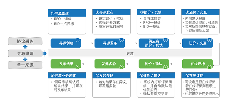 寻源管理:支持招投标、询报价、竞价、单一来源等多种寻源策略,在线发布、供方反馈及评标、定标等;