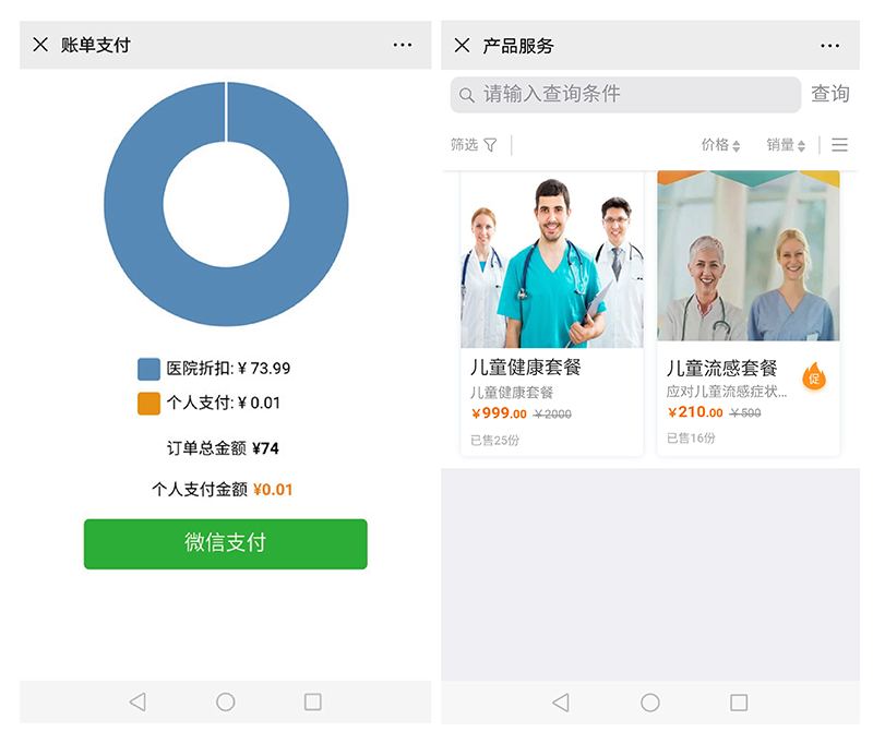 “掌上医患”服务支付平台为医疗机构提供更快捷的收费方式,通过与微信钱包支付平台合作,患者可以购买如豪华孕周套餐、肠镜检查套餐、心血管糖尿病相关体检套餐等医疗套餐,可以通过手机充值缴费,查询每次就诊的缴费情况,随时随地用微信支付医院已经处理完成的账单,减少就诊过程中不必要的缴费流程。此外,医疗机构可以组织发布如亲子、健康教育等活动信息,患者可以报名参与,增强医患之间的互动。