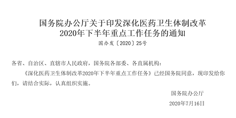 7月23日,国务院办公厅下发了《关于印发深化医药卫生体制改革2020年下半年重点工作任务的通知》。