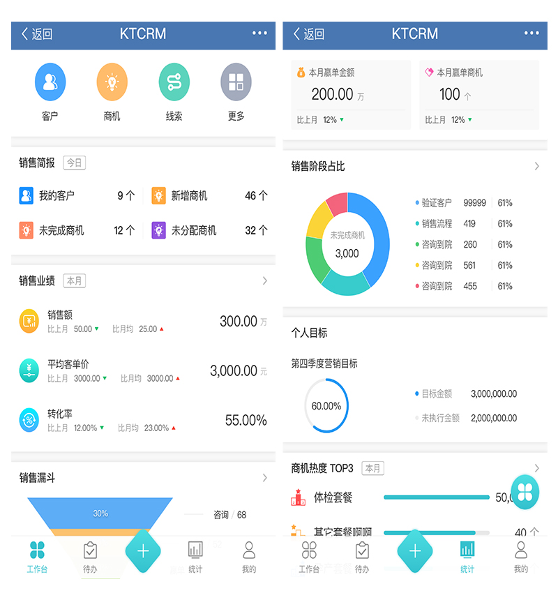 在销售维度上,支持从初次咨询到销售完成的全流程管理,可以对商机自定义多个销售阶段,记录商机跟进过程中的动态,生成销售漏斗,能够及时发现销售过程中出现的问题,保障销售目标的达成。同时系统还可实现自动化提醒,避免人工遗忘,对每一条销售线索都能精准监控。