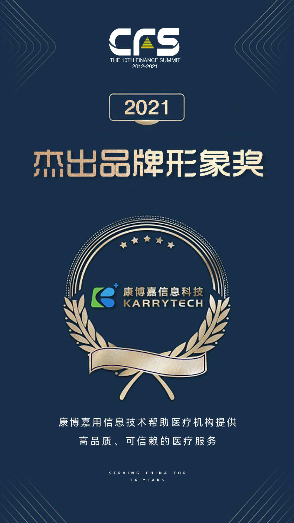 CFS第十届中国财经峰会获奖名单揭晓,作为高品质现代医院的信息化领跑者,康博嘉荣获「2021杰出品牌形象奖」,康博嘉创始人兼CEO祖凯先生亦获评「2020(医疗信息化)行业影响力人物」。
