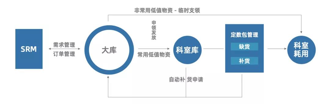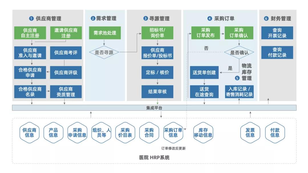 康博嘉HRP与 HIS 打通,对高值耗材、低值物资、药品和诊断试剂、固定资产进行智能管理,实现一物一码、实耗实销、二级库管、定数包等功能,减少手工制单,降本增效,达到从采购源头、进销存到使用分析的物资全生命周期管理。 4.供应商关系管理云平台(SRM)