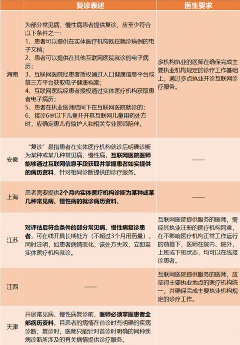 从海南、安徽、上海等省市的互联网医院管理规定来看,关于复诊、医生执业要求,虽然都在国家卫健委文件的框架之内,但各地形成了不同的细化版本。