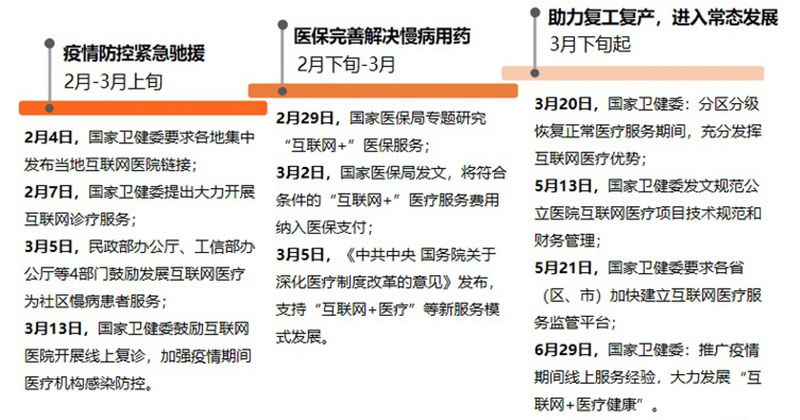 从上图可看出,随着疫情暴发、蔓延和平稳,政策分别鼓励互联网医疗紧急驰援疫情防控、完善医保支付以解决慢病患者用药,之后又鼓励发挥互联网医疗作用助力复工复产,直至在疫情防控常态化之后,推广此前的线上服务经验。